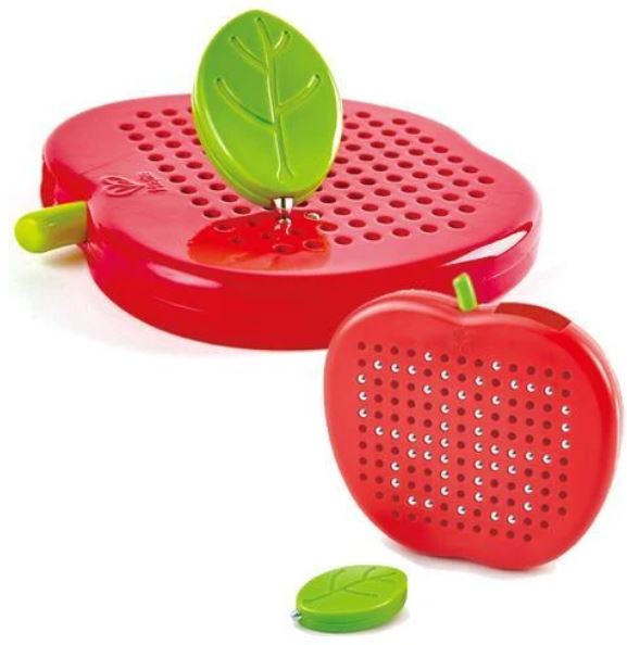 Esta manzana roja brillante está llena de bolitas de metal. Usa el bolígrafo magnético con forma de hoja para crear dibujos, patrones o lo que quieras.