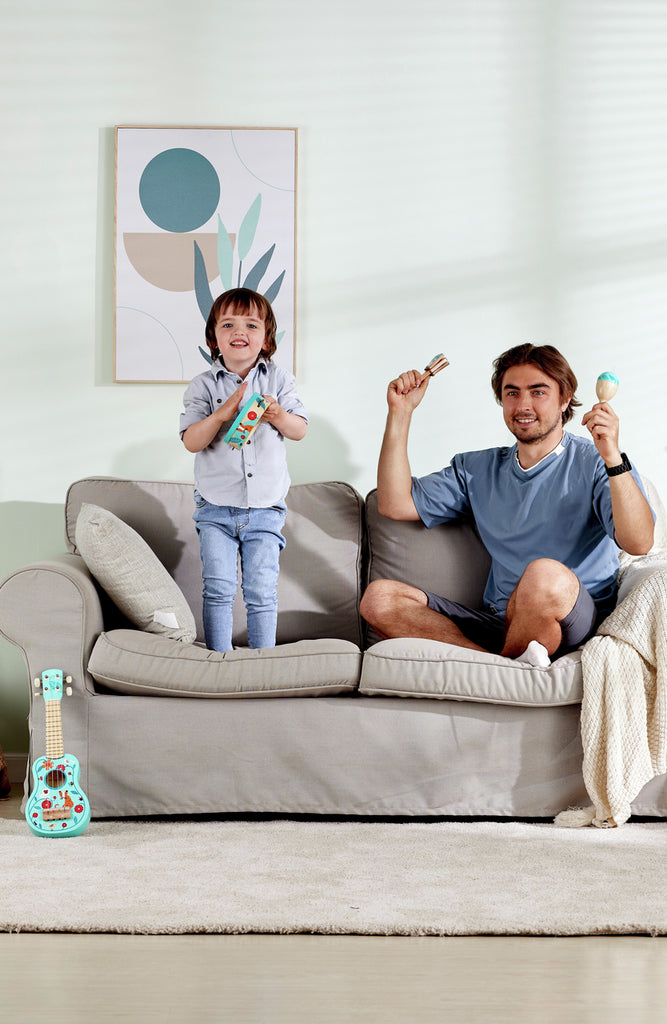 Crea tu propia banda con este brillante y vibrante set de ukelele. Invita a tus amigos y familiares a tocar tus canciones favoritas con el ukelele, la maraca, la pandereta y la castañuela realistas.