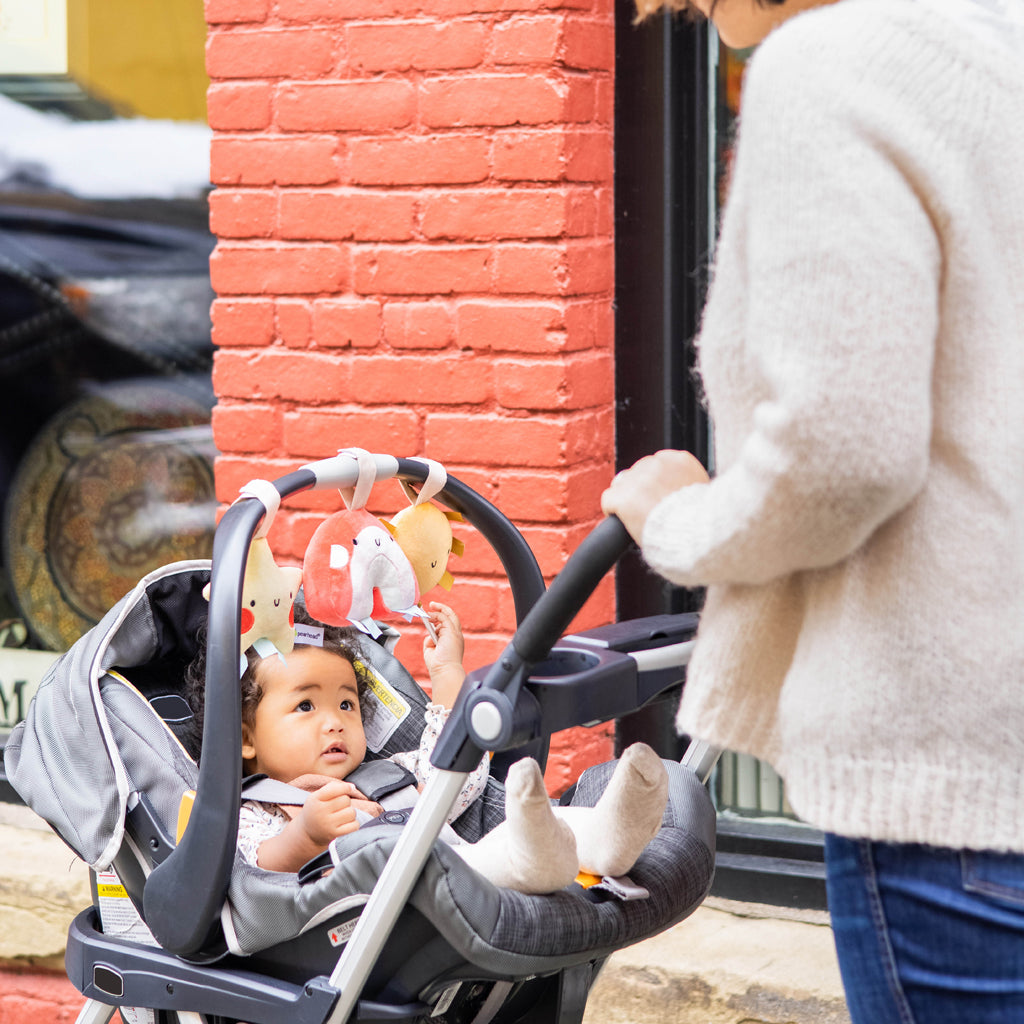 ¡A tu pequeño bebé le encantará jugar con estos adorables juguetes para cochecito o asiento de automóvil con forma de estrella, sol y arcoíris de Pearhead!