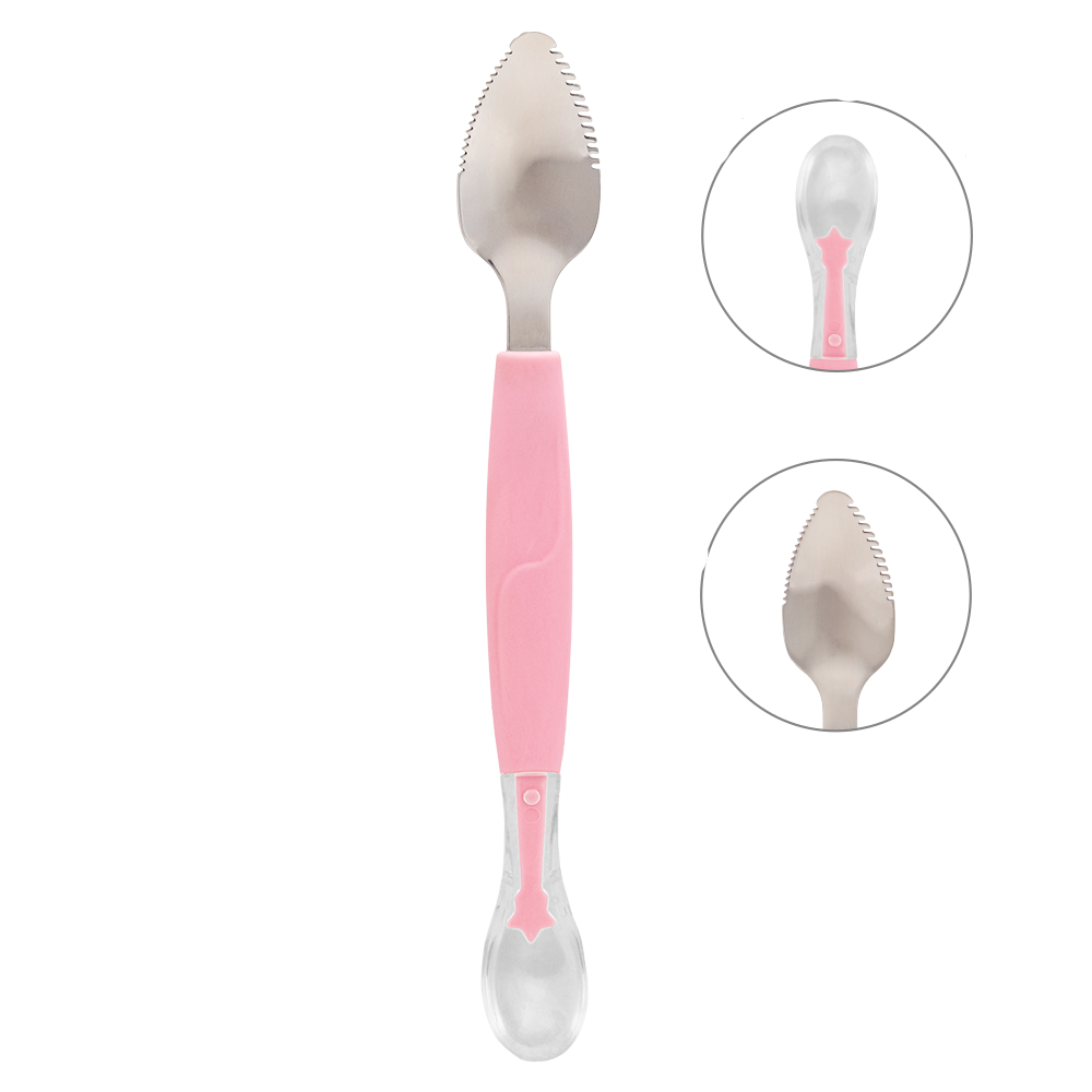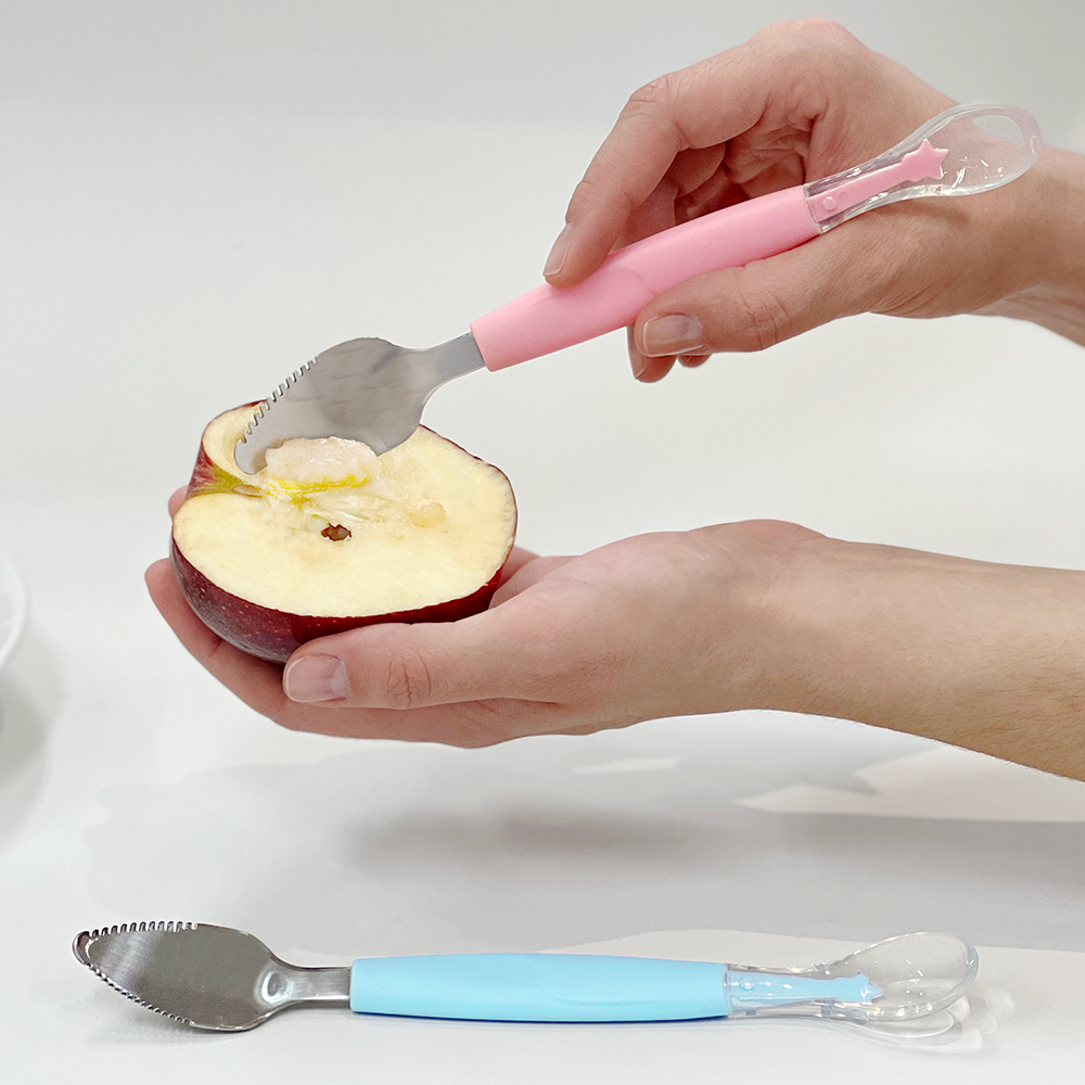 La cuchara 2 en 1 de Buba tiene un diseño multifuncional, con un lado hecho de acero inoxidable ligeramente dentado para raspar la fruta y el otro con una punta de silicona suave que lleva la comida a la boca del pequeño.