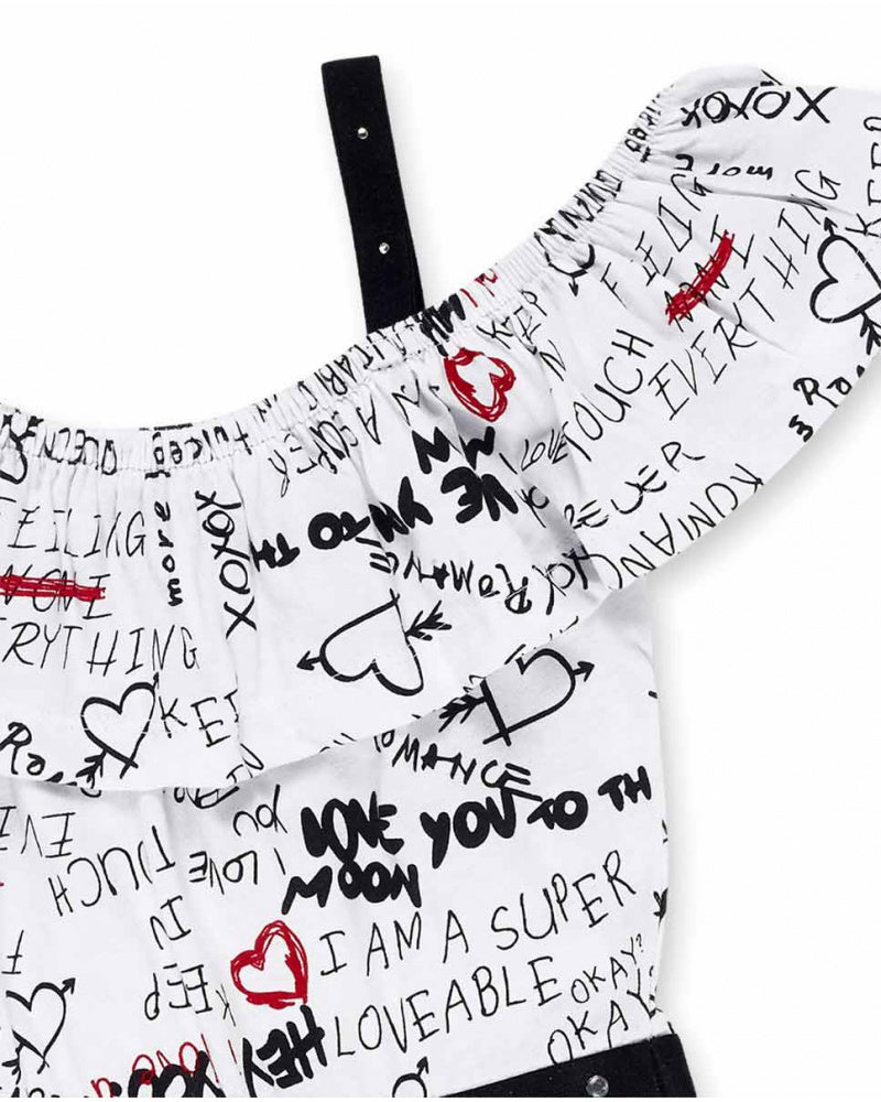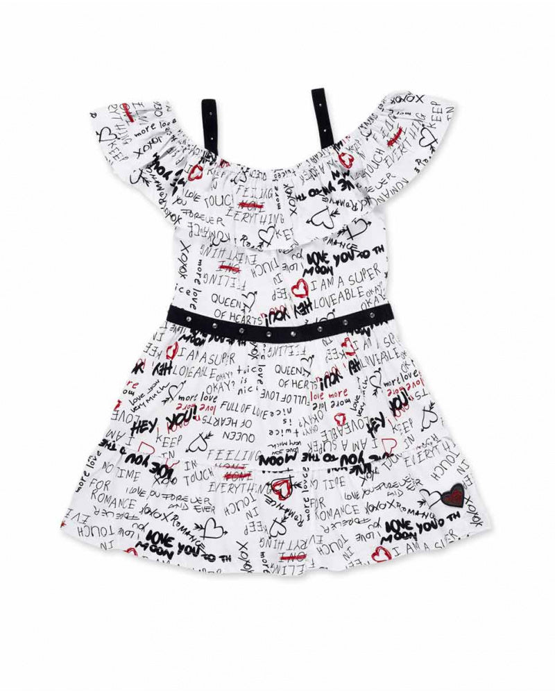 Vestido De Punto, De Color Blanco Con Estampado De Mensajes Y Corazones En Negro Y Rojo, Cintura De Color Negro Con Apliques Brillantes Y Volante Para Niña.