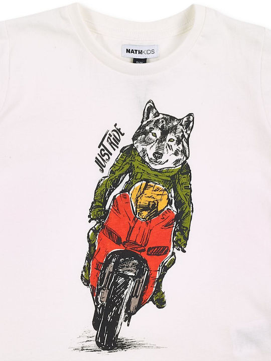 Conjunto De Punto Dos Piezas Para Niño. Camiseta De Punto, De Color Blanco Con Estampado De Lobo Motorista. Bermuda De Punto De Color Verde, Con Bolsillos, Cintura Elástica Y Cordón De Ajuste Blanco.