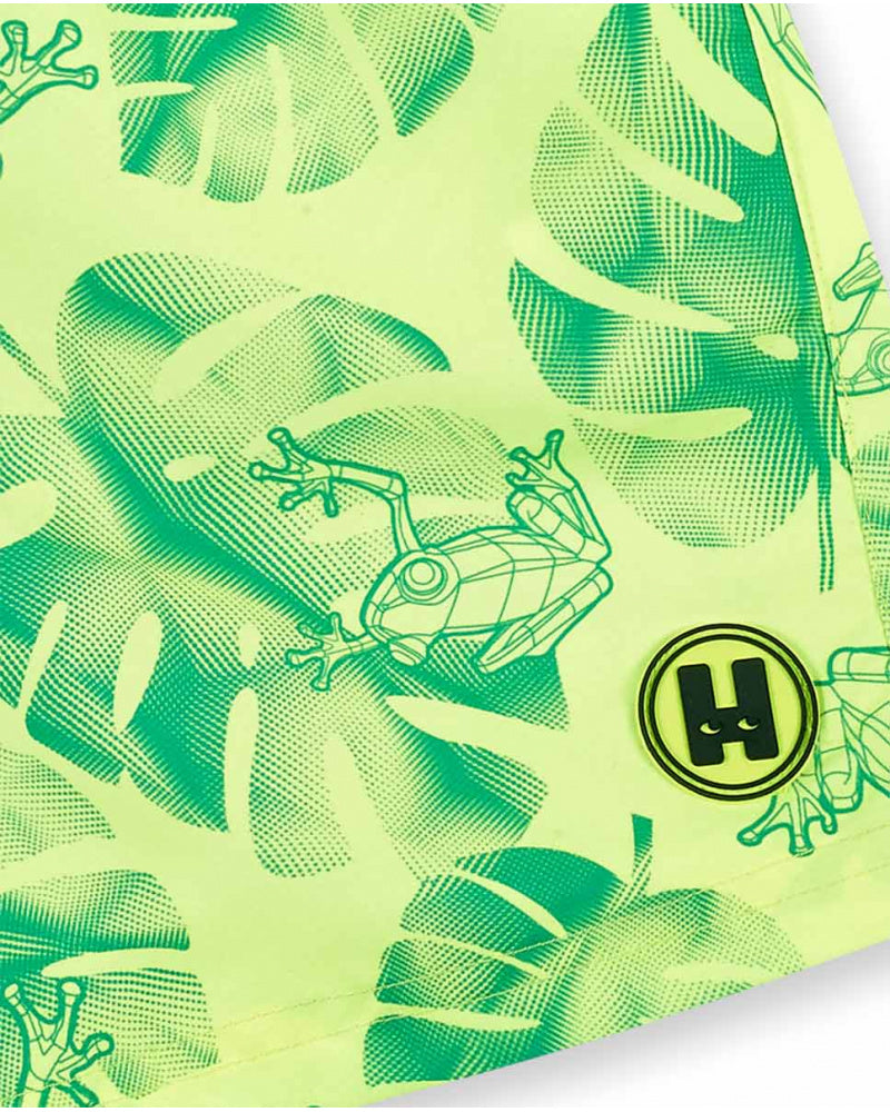 Bañador Tipo Bermuda, De Color Amarillo Con Estampado De Hojas Verdes Y Cordón De Ajuste Para Niño.