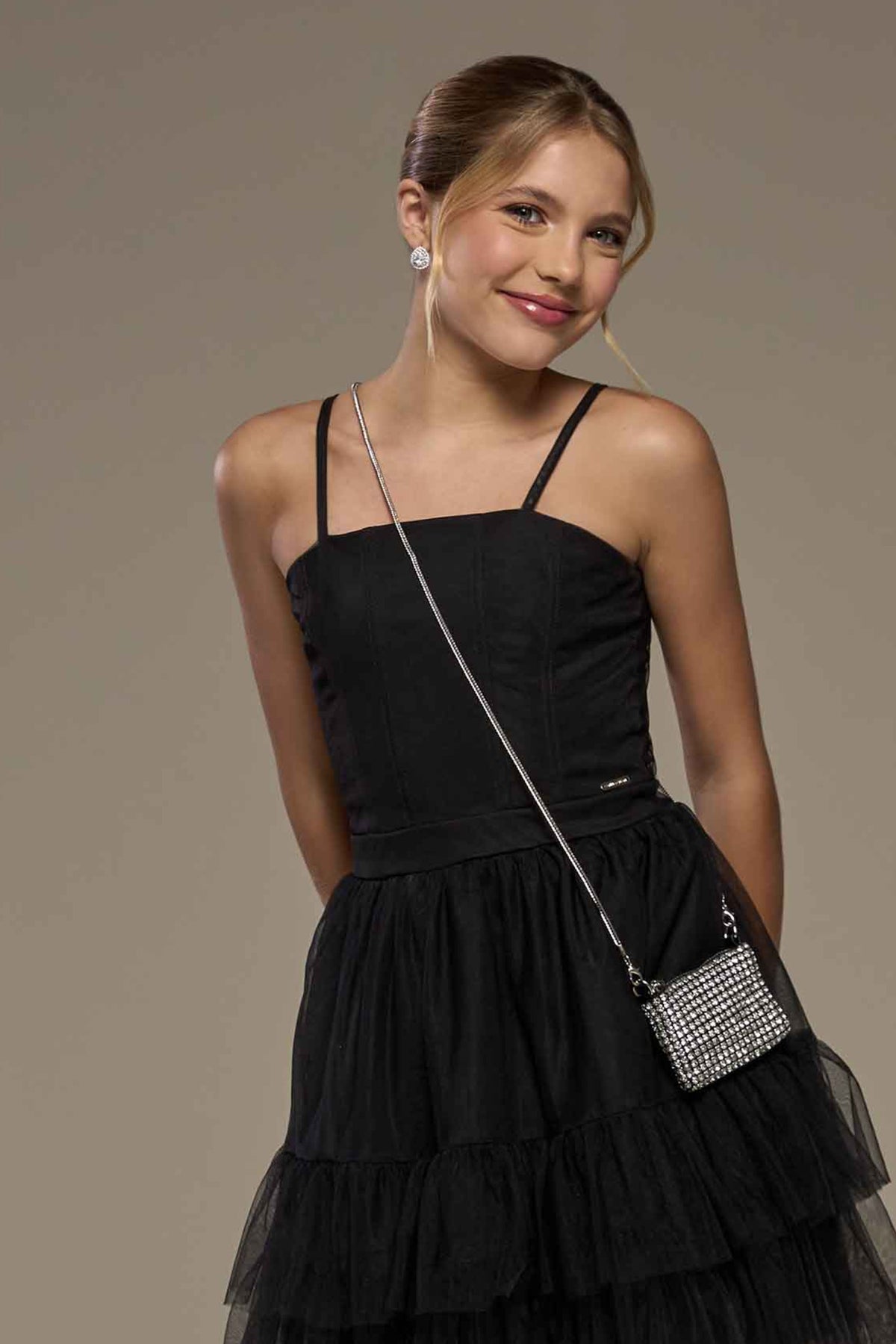 Enamórate de este hermoso vestido de fiesta de la colección Vanilla Cream, especialmente diseñado para ocasiones especiales. Con una capa de tul negro que le da un toque de elegancia y encanto, este vestido es perfecto para los momentos inolvidables de tu princesa.