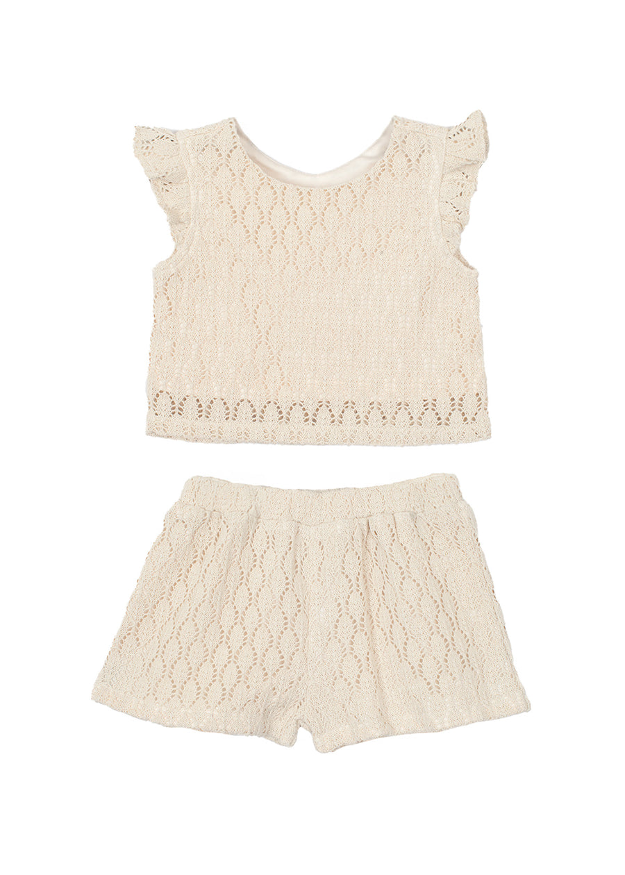 Este conjunto de 2 piezas tejido a crochet para niñas incluye una blusa con mangas onduladas y pantalones cortos a juego.