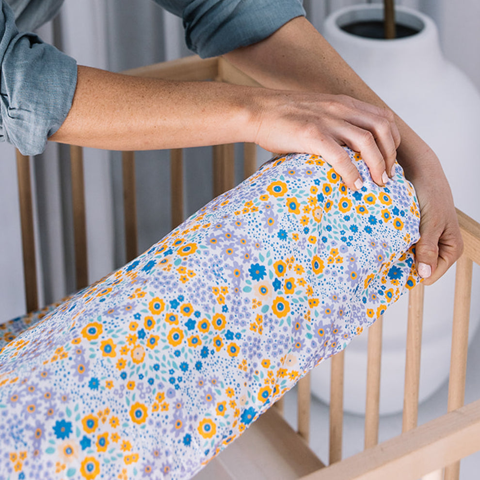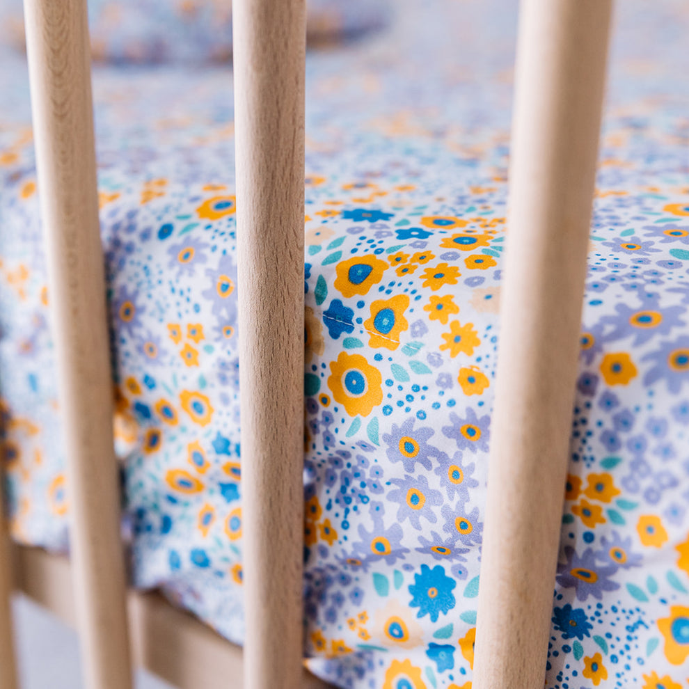 Antes de que puedas ver las flores, puedes sentir el cambio en el aire. Los días se vuelven más cálidos, el sol un poco más alto y sabes que el verano está a la vuelta de la esquina. Con tonos morados, azules de ensueño y amarillos vibrantes, la sábana impermeable para cuna Summer Flowers aporta un aire floral y soleado a la habitación de tu bebé.