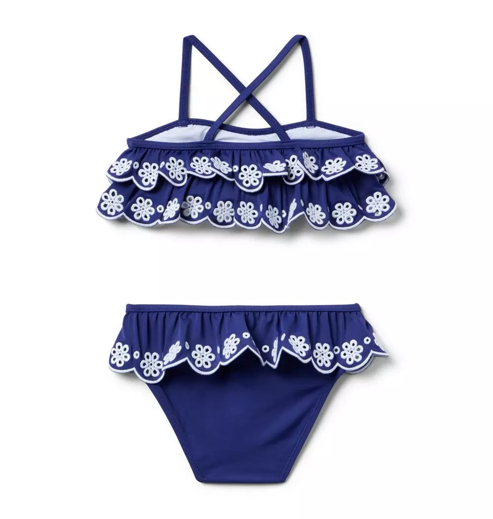 Con detalles florales de ojales y volantes festoneados, nuestro traje de baño siempre está a la moda. Diseñado con tirantes cruzados en la espalda y protección solar UPF 50+. Fabricado responsablemente con poliéster reciclado.