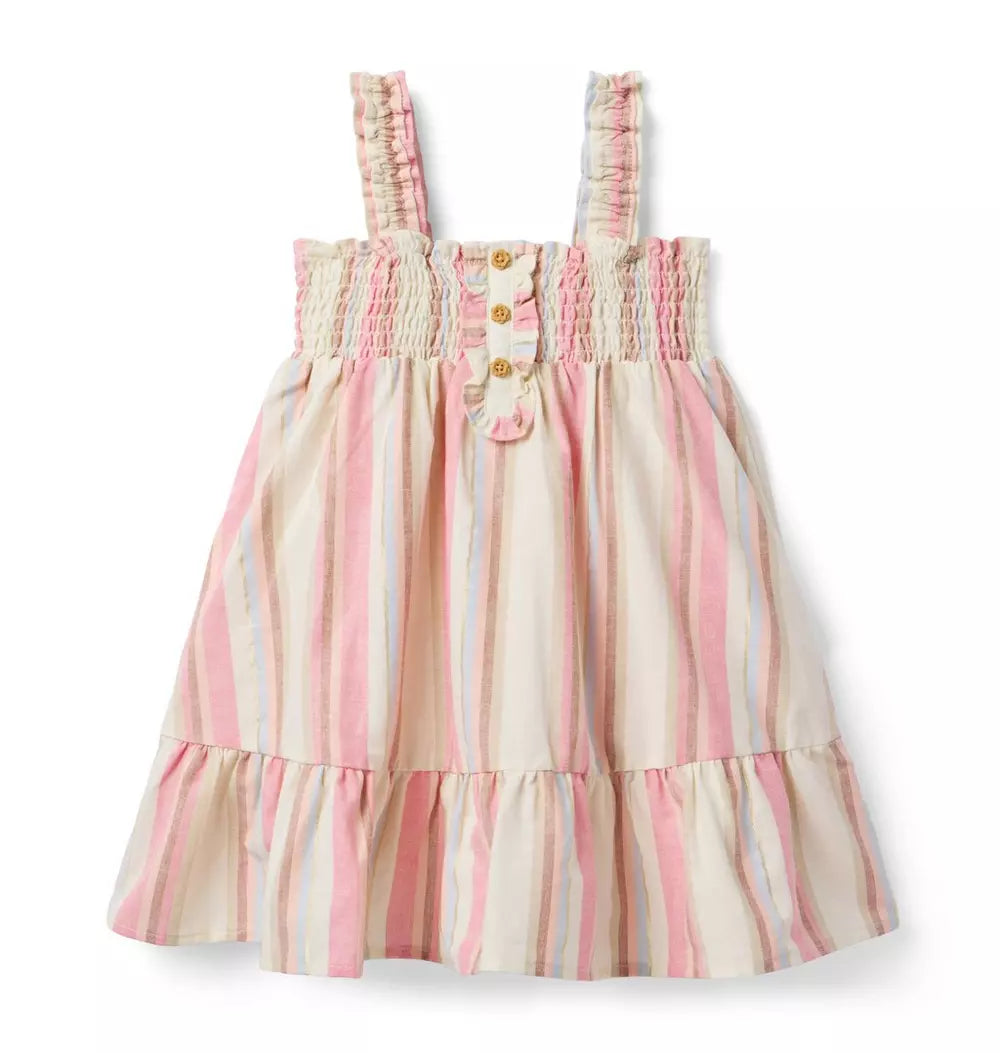 ¿Rayas, volantes y un toque de brillo? Nuestro vestido de lino y algodón lo tiene todo. Además, tiene un corpiño fruncido y botones.