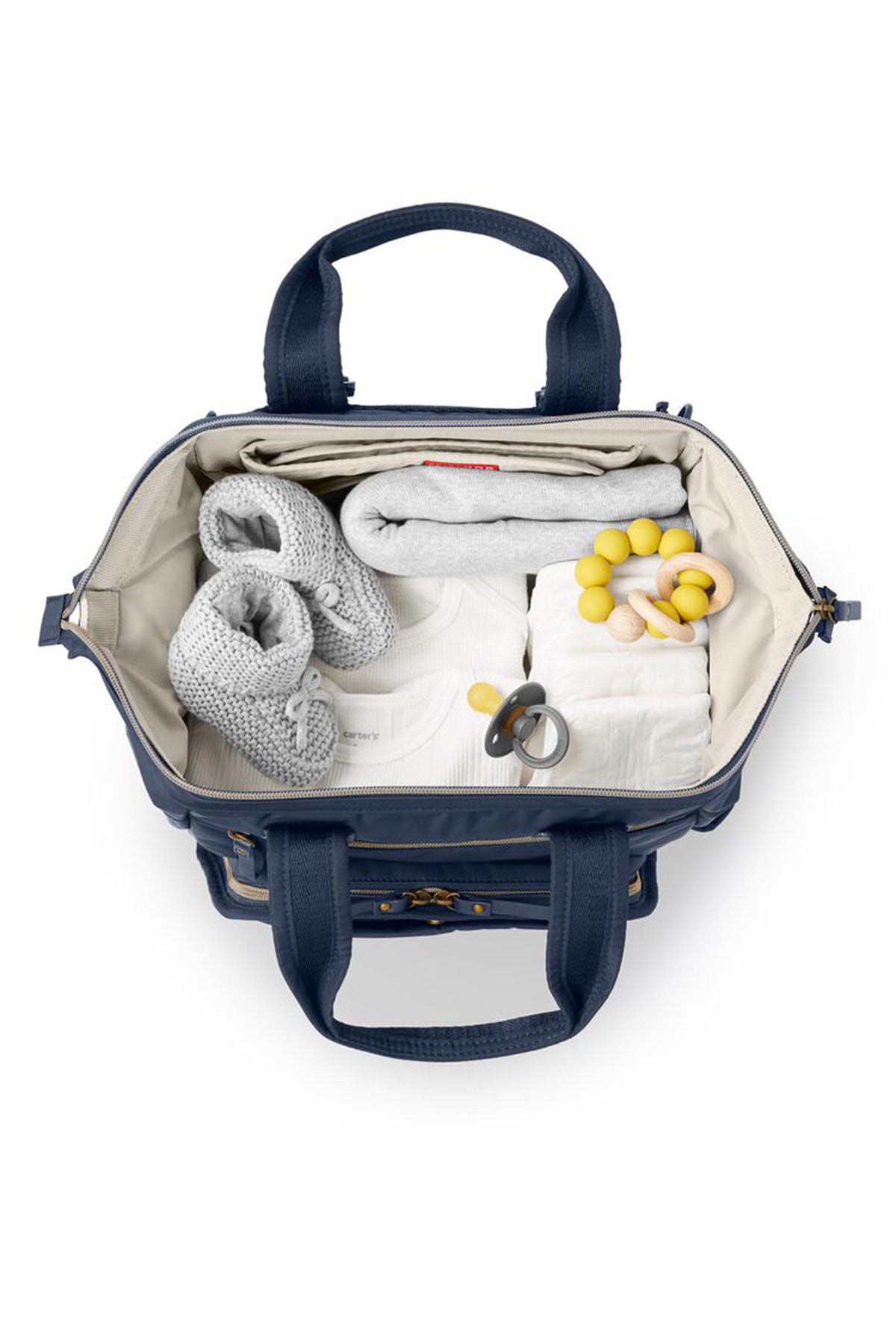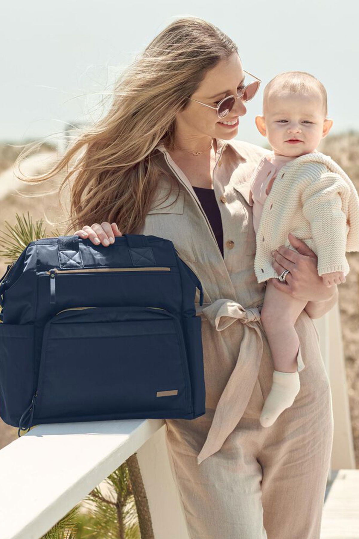 Dos bolsillos exteriores con cremallera; bolsillo de fácil acceso para el teléfono móvil; dos bolsillos térmicos para biberones; dos bolsillos interiores elásticos; correas de hombro ajustables; asas superiores ergonómicas de fácil agarre; correas funcionales para sujetar fácilmente el cochecito; incluye cambiador acolchado lavable a máquina.
