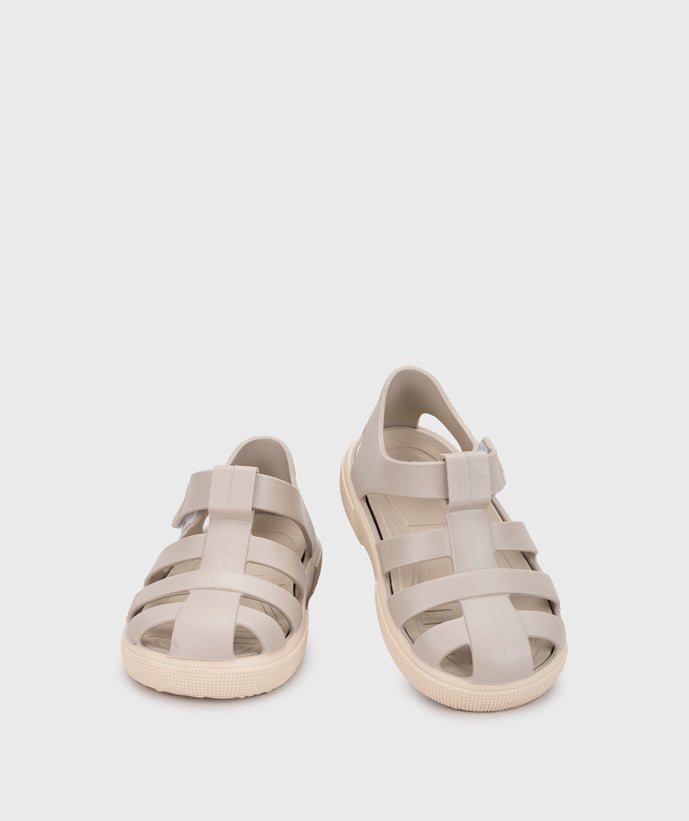Sandalias deportivas para niños IGOR con acabado mate que combinana con la suela de color beige, perfectas para la playa, la piscina o para disfrutar del día a día con total comodidad. Su diseño en PVC inyectado en una sola pieza ofrece resistencia y flexibilidad, mientras que el cierre en velcro al tobillo permite un ajuste fácil y seguro.