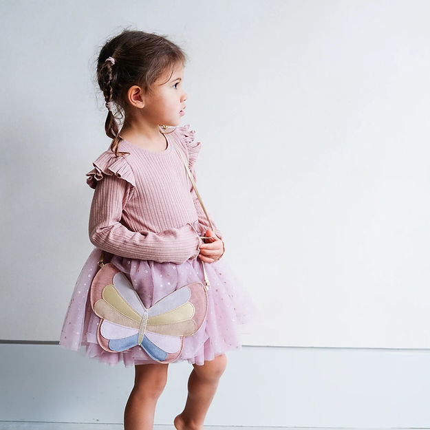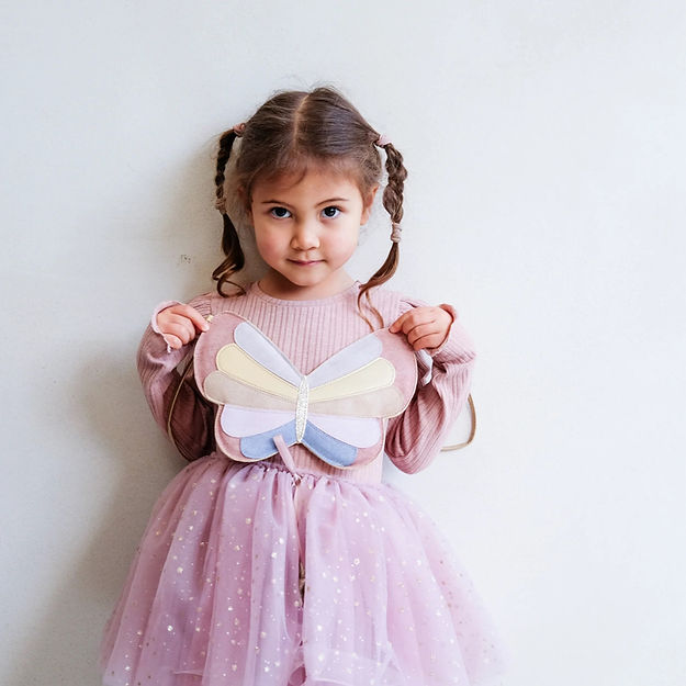 Vuela alto, mariposa. Este hermoso bolso con forma de mariposa está elaborado con las telas de gamuza más suaves y tiene detalles en dorado metálico. ¡Es un regalo perfecto para cualquier pequeña fanática de Flutterby!