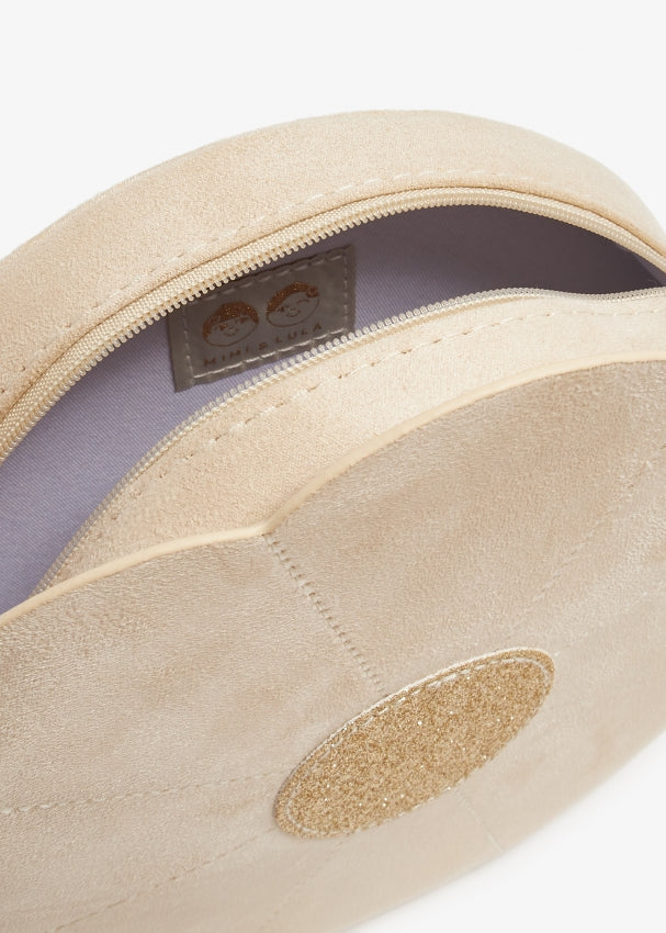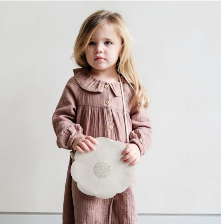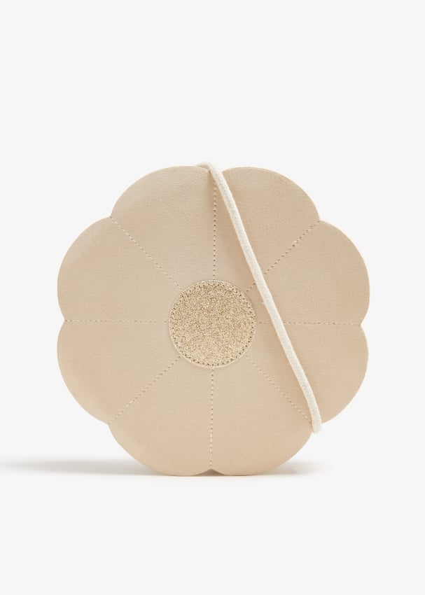Deja que tenga a mano lo esencial y que luzca linda con el bolso Daisy de Mimi & Lula. Este estilo compacto, de gamuza beige, se presenta con una silueta de margaritas, un cierre de cremallera y una correa delgada para llevarlo.