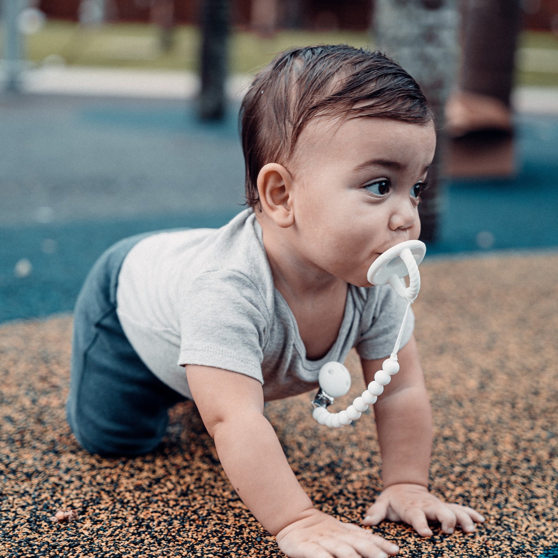 Pinzas versátiles para chupetes para recién nacidos : este paquete de 2 pinzas de goma para chupetes se adhieren a las camisas y baberos de bebé en un extremo y a un chupete o chupete en el otro para evitar que se caigan o se caigan cuando estás en el auto, en el cochecito o en movimiento.