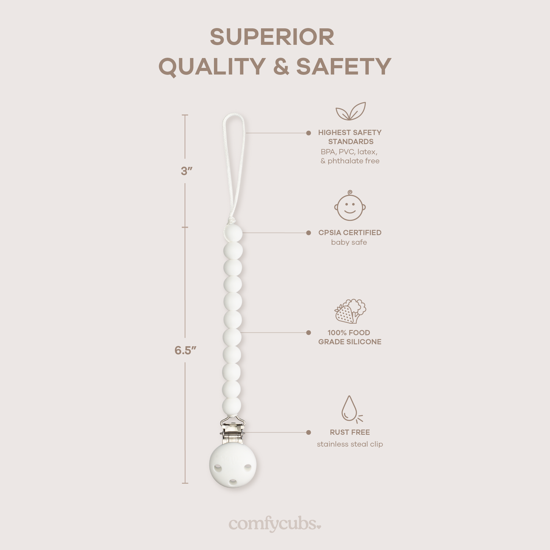La seguridad es lo primero : estos clips para chupetes están hechos con materiales de primera calidad y muy duraderos, una combinación de silicona de grado alimenticio sin BPA con un clip de acero inoxidable a prueba de óxido, son fáciles de limpiar y están garantizados para resistir la prueba del tiempo.