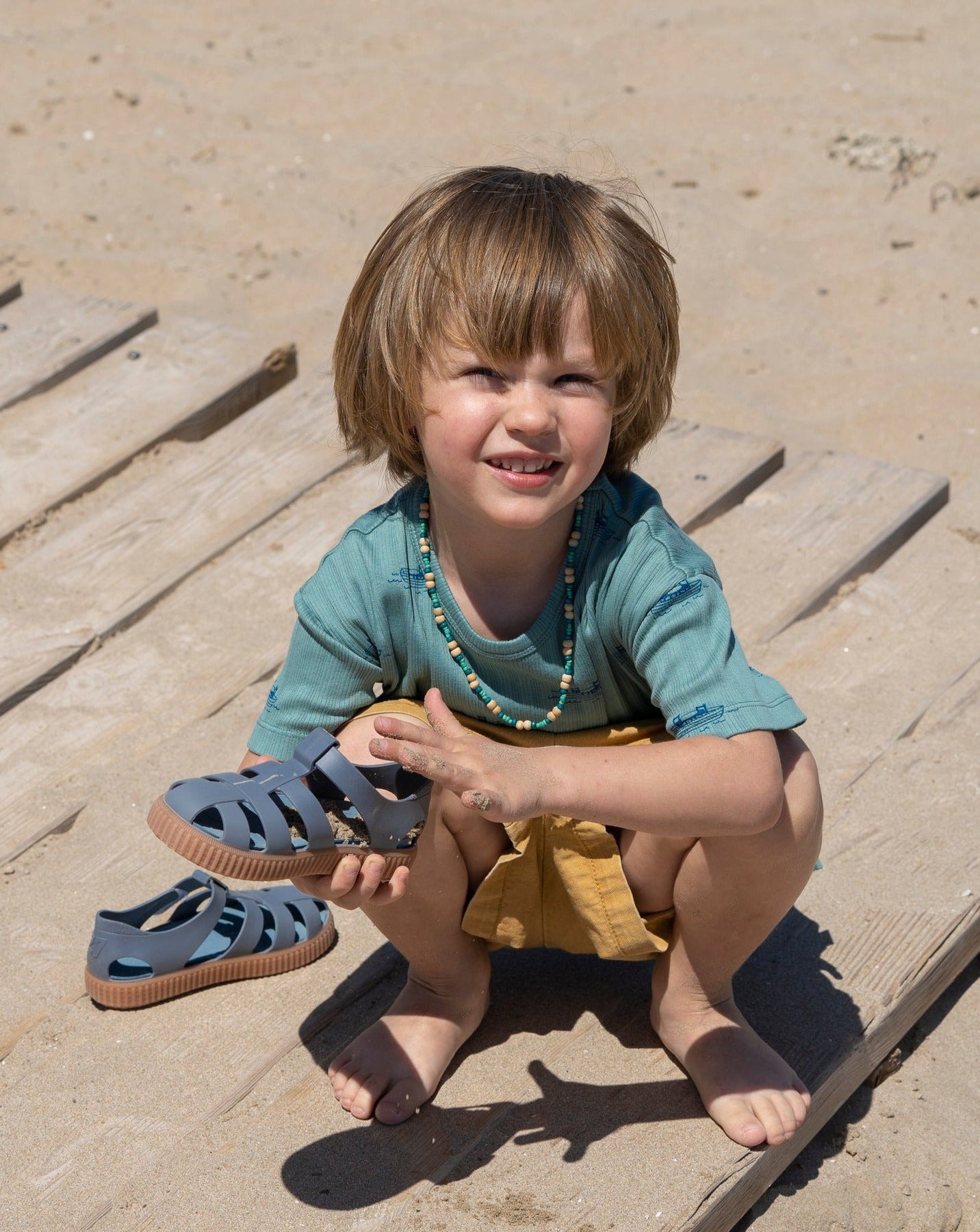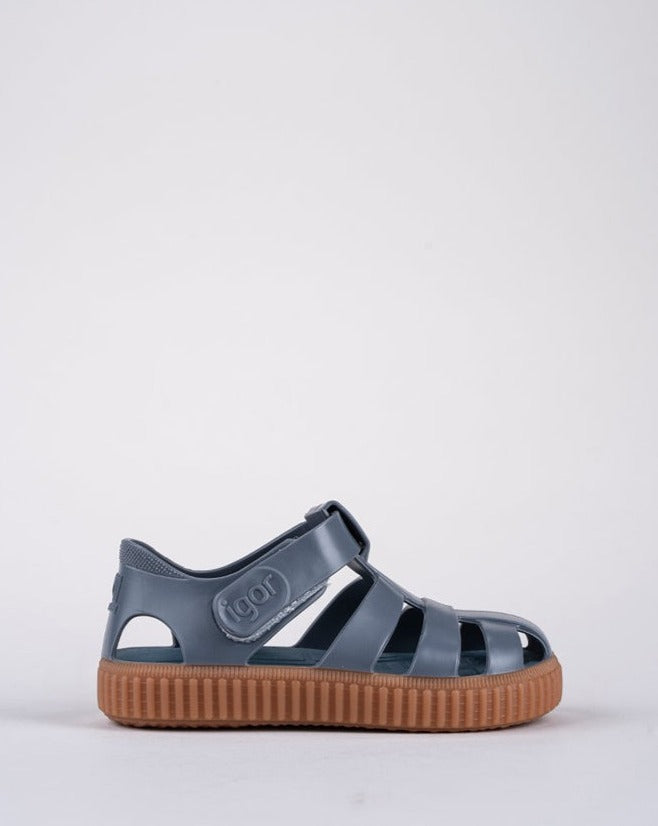 Sandalias deportivas para niños IGOR con acabado mate que combinana con la suela de color caramelo, perfectas para la playa, la piscina o para disfrutar del día a día con total comodidad. Su diseño en PVC inyectado en una sola pieza ofrece resistencia y flexibilidad, mientras que el cierre en velcro al tobillo permite un ajuste fácil y seguro.
