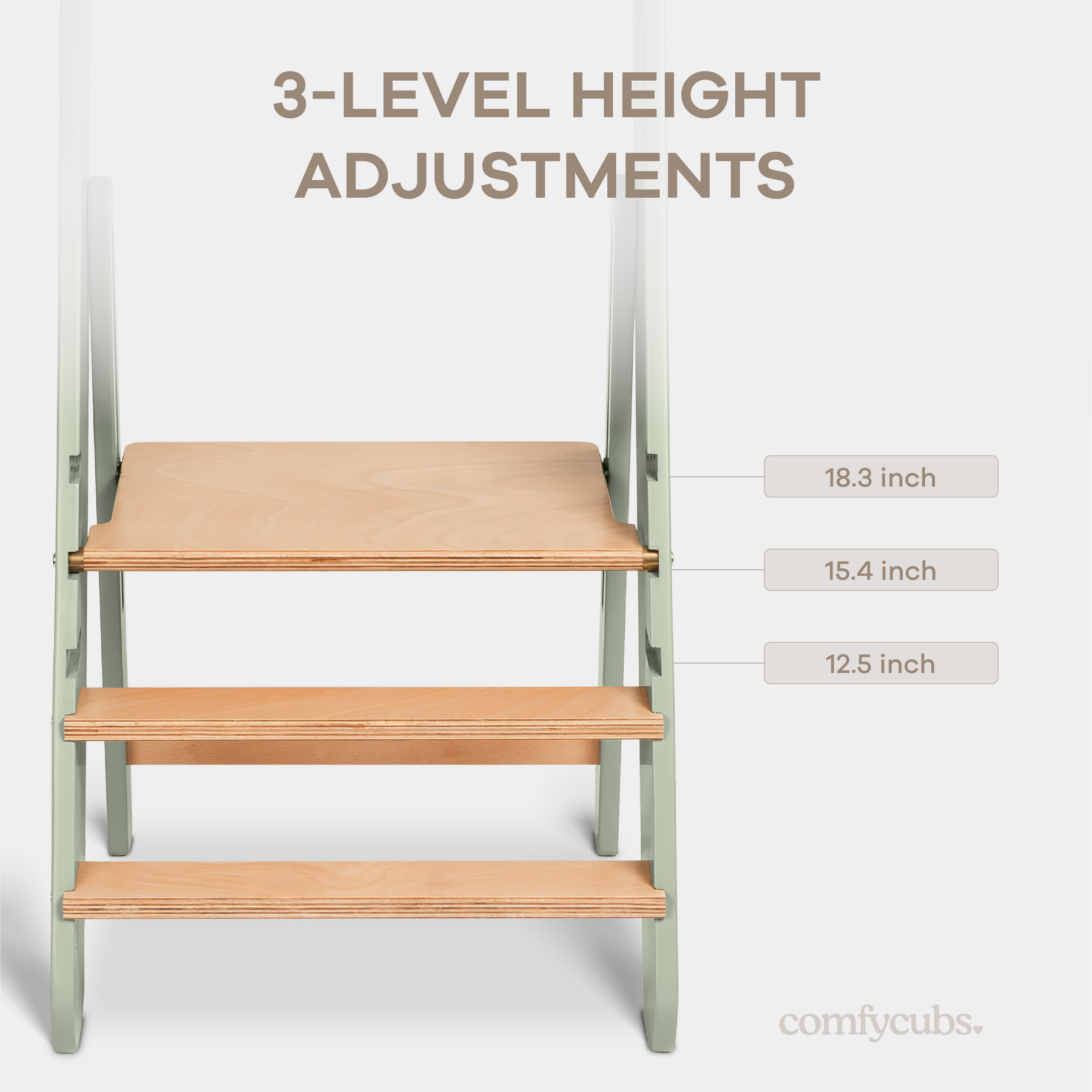 El taburete Comfy Cubs para niños pequeños cuenta con tres niveles de altura ajustables, lo que permite a tu hijo alcanzar lavabos, encimeras o mesas con seguridad a medida que crece, fomentando su confianza e independencia desde pequeño. Al ajustarlo al nivel 3, asegúrate de ajustar el rodamiento en la segunda ranura para un ajuste seguro y adecuado.