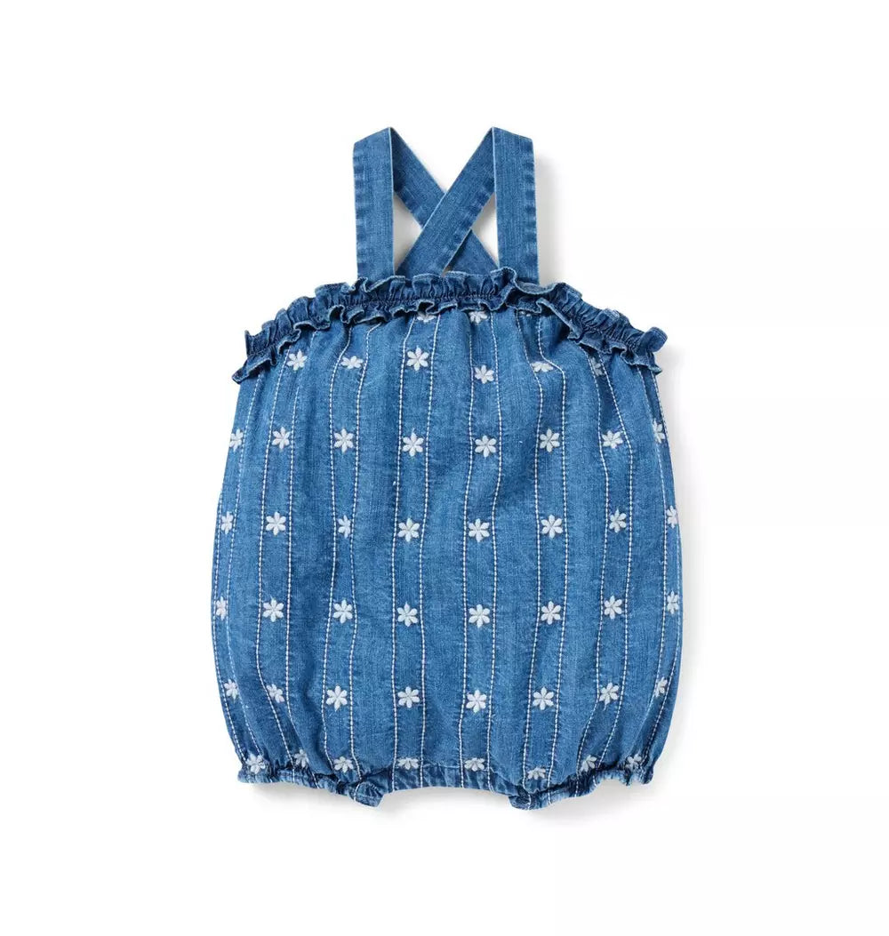 La prenda perfecta para tus primeras aventuras o simplemente porque sí. En chambray de puro algodón con bordado floral, volantes y un pequeño bolsillo trasero.