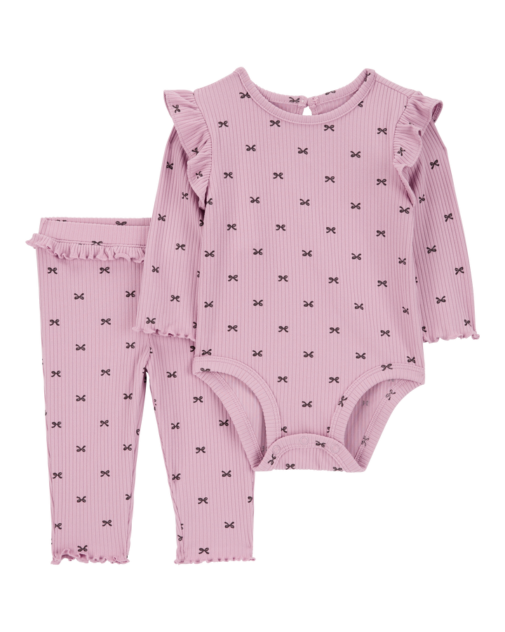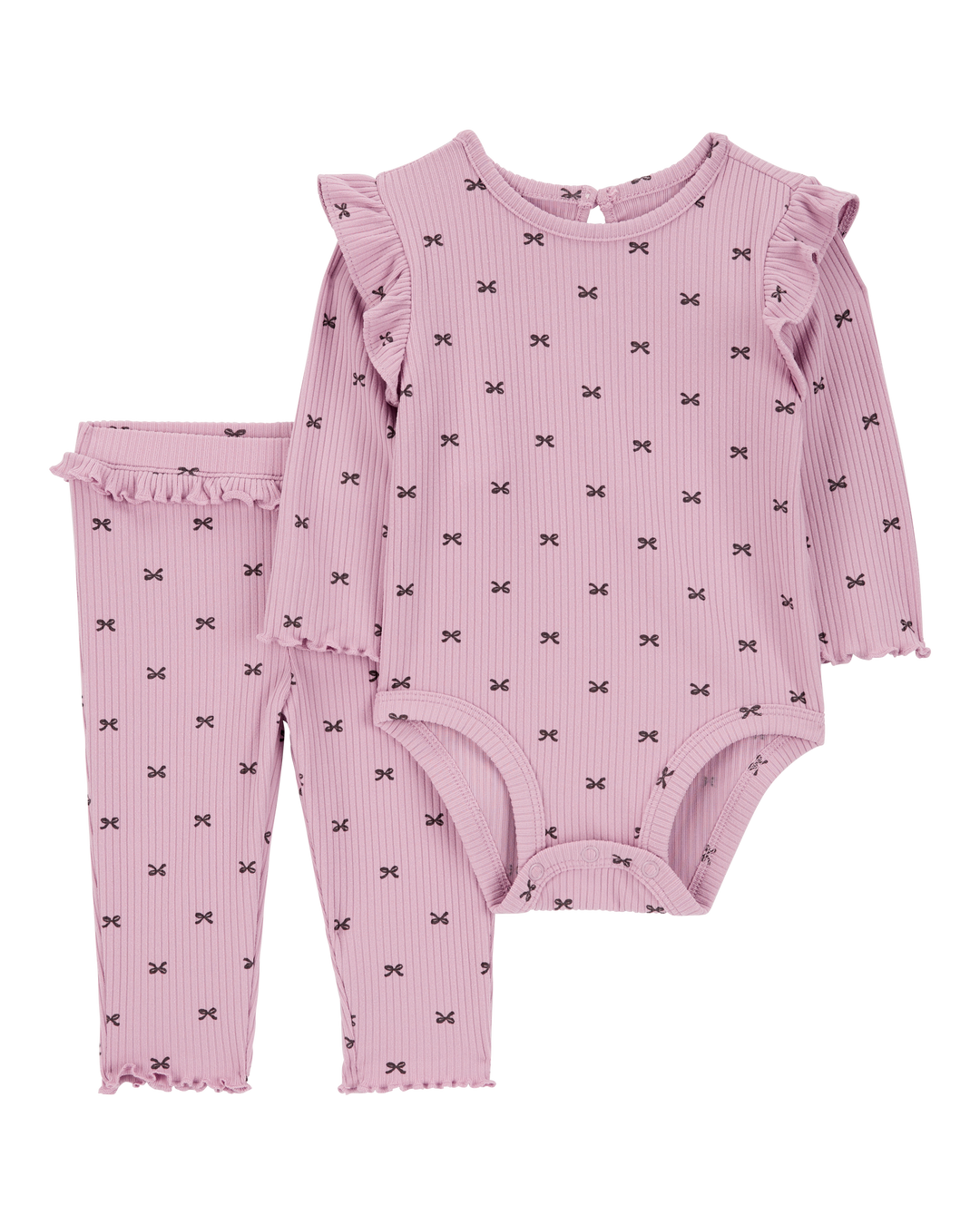 Hecho A Juego, Este Conjunto Se Completa Con Un Body Con Vuelo De Manga Larga Para Combinar Con Pantalones Cómodos, Todo Con Un Estampado De Lazo Por Todas Partes.