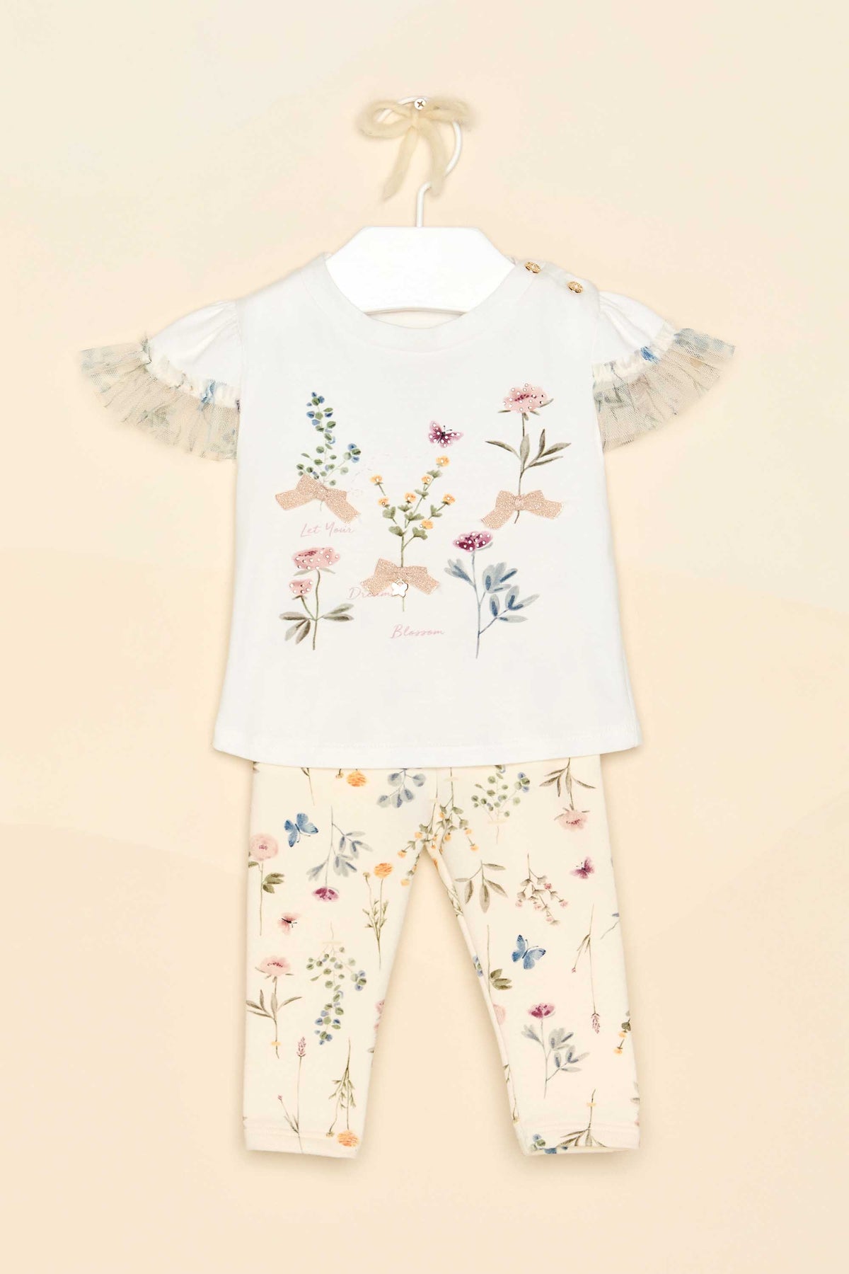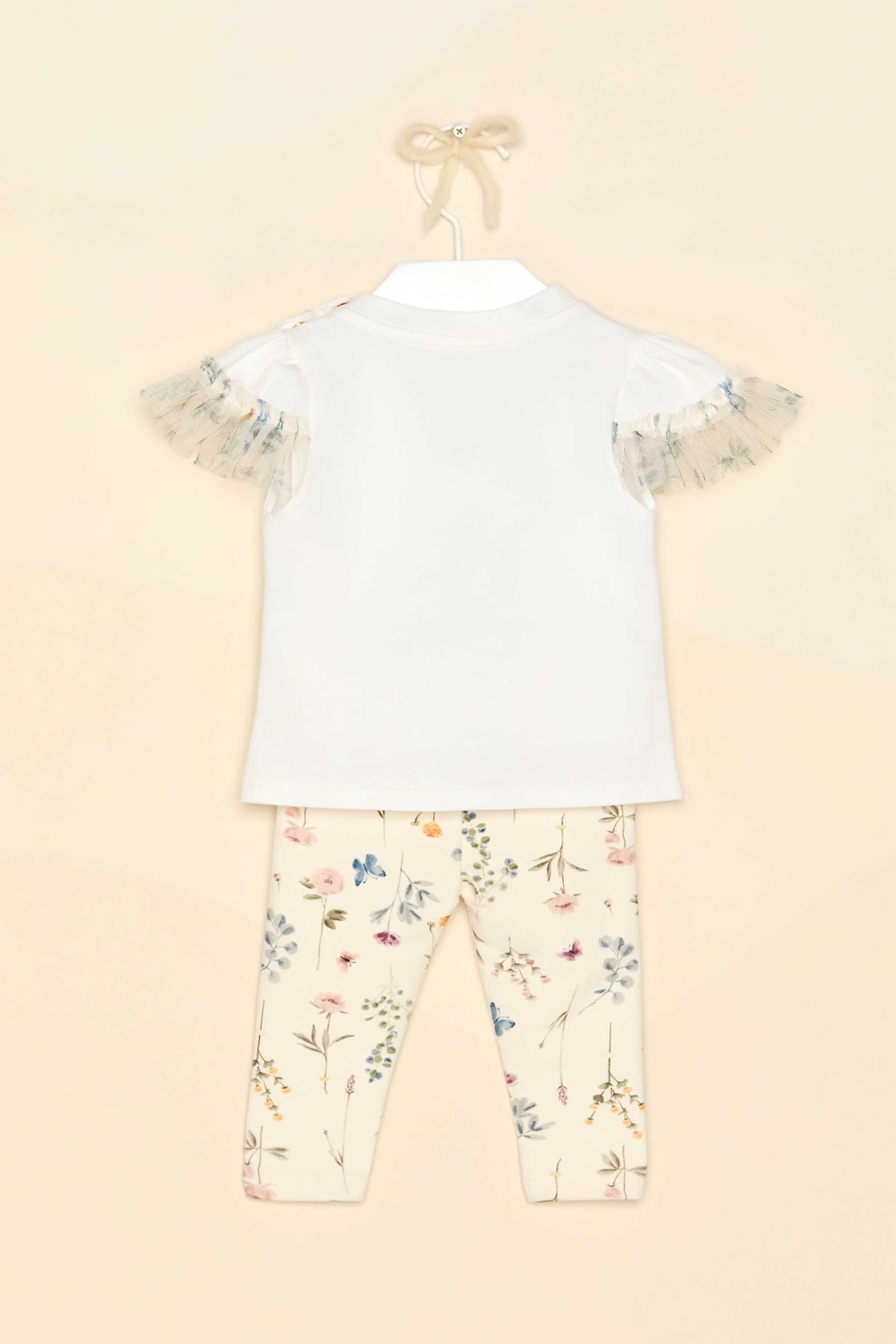 El conjunto Petit Cherie se inspira en el romanticismo para crear un look encantador. La blusa luce un delicado estampado floral con lazos y brillo, además de mangas con volantes de tul estampado, que le aportan un toque divertido y elegante. Incluye leggings de punto suave con estampado floral y de mariposas, perfectos para disfrutar de la comodidad y el estilo en salidas y ocasiones especiales.